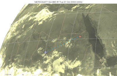 The Meteosat 7 satellite captured the event which was seen by a KLM pilot and recorded on seismograms in Kenya [above, cross is location of KLM plane, circle is the asteroid impact site.]