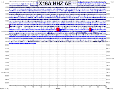 Jeri Young also passed along this shot of the seismic signals received by the nearest station in our network, Strawberry/Payson X16A, about 65 km east of last night's quakes. All three of the bigger quakes, M3.3, M4.1 and M4.0, are easily visible by the red waveforms at their start.