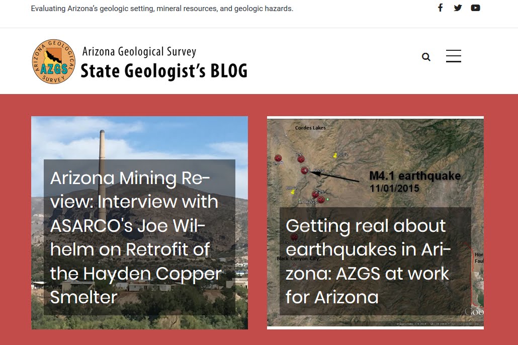 Please join us at our new site http://blog.azgs.arizona.edu/ for frequent and telling updates on the state of Arizona’s mineral resources, new geologic maps and reports, and for geologic hazard assessment and analysis: landslides, floods, earthquakes, debris flows, earth fissure, radon, and more.